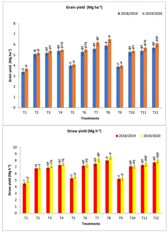 Effect of bio–fertilizers and reduction of the recommended dose of mineral fertilizers (RDP) on grain yield (Mg ha−1), straw yield (Mg ha−1), and biological yield (Mg ha−1) of barley under saline conditions during 2018/2019 and 2019/2020 seasons. T1: without bio-fertilizer + 50% NPK, T2: Phosphorin + 50% NPK, T3: Rhizobacterin + 50% NPK, T4: Microbein + 50% NPK, T5: without bio-fertilizer + 75% NPK, T6: Phosphorin + 75% NPK, T7: Rhizobacterin + 75% NPK, T8: Microbein + 75% NPK, T9: without bio-fertilizer + 100% NPK, T10: Phosphorin + 100% NPK, T11: Rhizobacterin + 100% NPK, and T12: Microbein + 100% NPK; bar represents the standard error, different letters next to the values point to significant differences at p ≤ 0.05 according to Duncan’s multiple range test.