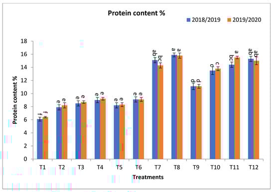 In relation to protein content %, T12, T11, T8, T7, and T10 gave the highest values at the first year and second year, respectively, as shown in Figure 2. The percentage increases compared with the recommended dose (T9) were 39.6, 37.8, 28.8, 25.2, and 21.6 and 41.4, 39.6, 32.4, 27.9, and 24.3% in the first year and second year, respectively. In the interim, the increases compared with the same dose of mineral fertilizer without bio-fertilizer were 39.6, 37.8, 74.4, 69.5, and 21.6 and 41.4, 39.6, 77.1, 71.1, and 24.3% in the first year and second year, respectively, as shown in Figure 2.