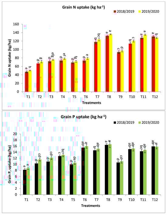 Concerning grain P uptake (kg ha−1), T8, T12, T6, T10, T7, T11, T4, and T3 gave the highest values at the first year and second year, respectively, as shown in Figure 2. The percentage increases compared with the recommended dose (T9) were 51.9, 50.0, 46.2, 41.5, 37.7, 34.0, 19.8, and 2.8 and 50.0, 47.3, 45.5, 38.2, 37.3, 33.6, 19.1, and 10.9% in the first year and second year, respectively, while the increases over the same dose of mineral fertilizer without bio-fertilizer were 61.0, 50.0, 55.0, 41.5, 46.0, 34.0, 54.9, and 32.9 and 58.7, 47.3, 53.9, 38.2, 45.2, 33.6, 50.6, and 40.2% in the first year and second year, respectively, as shown in Figure 2.