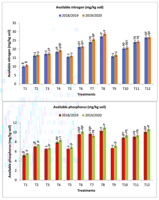 Regarding available nitrogen (mg/kg soil), the application of bio-fertilizer combined with rates of mineral fertilizer significantly improved the availability of nitrogen in the soil, and the treatments T8, T12, T6, T10, T7, T11, T4, T2, and T3 gave the highest values at the first year and second year, respectively, as shown in Figure 3. The percentage increases compared with the recommended dose (T9) were 71.7, 67.9, 51.6, 51.6, 34.0, 28.3, 15.7, 8.8, and 2.5 and 72.5, 61.1, 53.3, 45.5, 29.3, 25.2, 16.2, 4.8, and 0.0% in the first year and second year, respectively. Meanwhile, the increases compared with the same dose of mineral fertilizer without bio-fertilizer were 76.1, 67.9, 55.5, 51.6, 37.4, 28.3, 84.0, 73.0, and 63.0 and 78.9, 61.1, 59.0, 45.5, 34.2, 25.2, 81.3, 63.6, and 56.1% in the first year and second year, respectively, as shown in Figure 3.