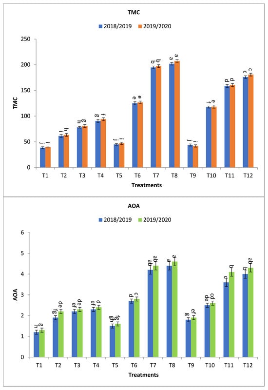 Regarding antioxidant activity of soil ug ascorbic acid/g dry soil (AOA), T8, T7, T12, T11, T6, T10, T4, T3, and T2 have the maximum impact on increasing the antioxidant activity of soil in both seasons with values in the first year and second year, respectively, as shown in Figure 3. The percentage increases compared with the recommended dose (T9) were 144.4, 133.3, 122.2, 100.0, 50.0, 38.9, 27.8, 22.2, and 5.6 and 142.1, 131.6, 126.3, 115.8, 47.4, 36.8, 26.3, 21.1, and 15.8% in the first year and second year, respectively. Meanwhile, the increases compared with the same dose of mineral fertilizer without bio-fertilizer were 193.3, 180.0, 122.2, 100.0, 80.0, 38.9, 91.7, 83.3, and 58.3 and 187.5, 175.0, 126.3, 115.8, 75.0, 36.8, 84.6, 76.9, and 69.2% in the first year and second year, respectively, as shown in Figure 2.