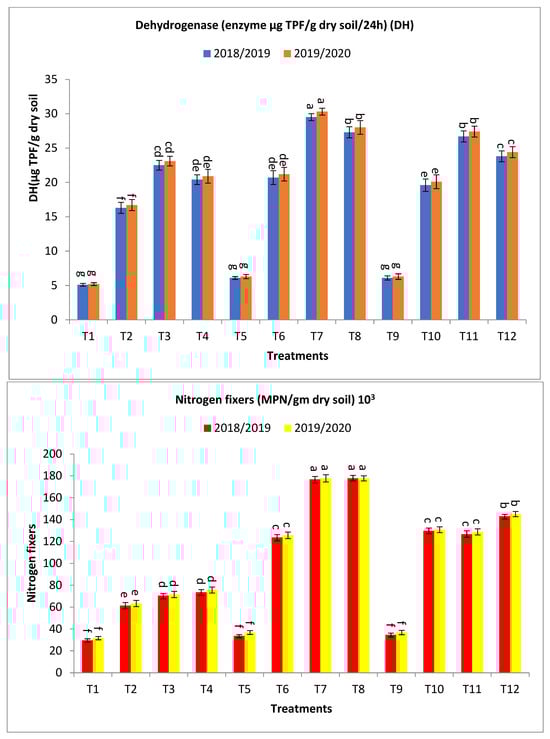 Effect of bio-fertilizers and reduction of the recommended dose of mineral fertilizers (RDP) on available nitrogen (mg/kg soil), available phosphorus (mg/kg soil), total microbial count ×105 cfu/g dry soil, antioxidant activity of soil ug ascorbic acid/g dry soil (AOA), dehydrogenase (enzyme μg TPF/g dry soil/24 h), nitrogen fixers (MPN/gm dry soil) 103, and phosphate-solubilizing bacteria (PDB) counts (CFU/gm dry soil) of barley under saline conditions during 2018/2019 and 2019/2020 seasons. T1: without bio-fertilizer + 50% NPK, T2: Phosphorin + 50% NPK, T3: Rhizobacterin + 50% NPK, T4: Microbein + 50% NPK, T5: without bio-fertilizer + 75% NPK, T6: Phosphorin + 75% NPK, T7: Rhizobacterin + 75% NPK, T8: Microbein + 75% NPK, T9: without bio-fertilizer + 100% NPK, T10: Phosphorin + 100% NPK, T11: Rhizobacterin + 100% NPK, and T12: Microbein + 100% NPK; bar represents the standard error, different letters next to the values point to significant differences at p ≤ 0.05 according to Duncan’s multiple range test.