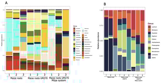 Relative abundances of bacterial (A) and fungal (B) taxa among the endophytic communities from maize plant roots cultivated in a milpa system.