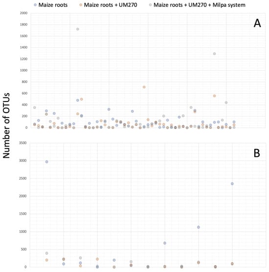 The increase in the number of these OTUs was better observed in Figure 2 (panels A and B) for bacteria and fungi, respectively. Some OTUs, shown in gray color, unexpectedly increased in the milpa system (Treatment 3, maize roots + UM270 + Milpa system), which belong to Burkholderia and Variovorax genera. Other N-fixing bacteria were also increased in plants inoculated with the UM270 strain, but not at the same level detected in the genera Burkholderia and Variovorax. It was also noted that some OTUs, such as Candidatus Phytoplasma (a phytoplasma taxon associated with aster yellows disease), were also increased in one of the composed samples. However, no disease symptoms were detected in the maize plants.