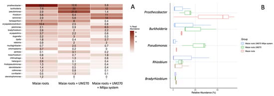 Heatmap of relative bacterial abundances of endophytic bacteriome detected in maize roots (Panel (A)), as well as the top five bacterial out treatments (Panel (B)).