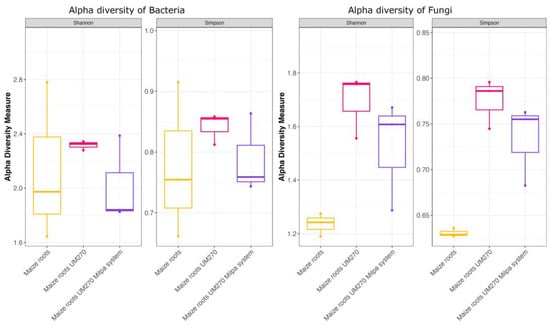Alpha diversity indexes (measured by Shannon and Simpson diversity indexes) of bacterial and fungal endophytic communities from maize plant roots under three different experiments. Maize roots uninoculated (controls), maize roots inoculated with P. fluorescens UM270, and maize roots inoculated with P. fluorescens UM270 under a milpa system growth.