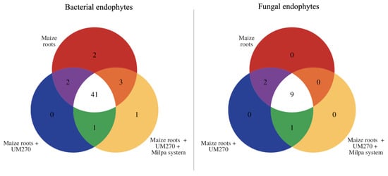 Shared OTUs among treatments. Regarding the unique OTUs found in the treatments where the UM270 strain was inoculated in a Milpa system, only one was found; On the other hand, there were no unique OTUs in corn roots inoculated with UM270. The maize root endobiome showed only two OTUs that were unique, while, for the diversity of fungal endophytes, no unique OTUs were found in each of the three treatments.
