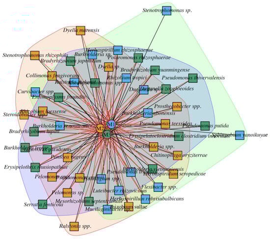 Network analysis of endophytic bacterial communities (endobiomes) from maize plant roots cultivated in a milpa system, inoculated or not with P. fluorescens UM270. The boxes represent individual endobiomes: M1 (maize roots), M2 (maize + root UM270), and M3 (maize + UM270 + milpa system). In the network, black lines indicate species that are unique and not present in the endobiomes. In contrast, the red lines indicate interactions or co-occurrences of species in the endobiomes.