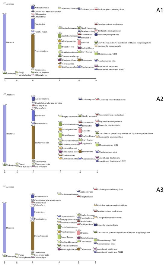 Taxonomic profiles of the rhizosphere metagenomes of maize (A1); maize inoculated with UM270 (A2), and maize inoculated with UM270 in a Milpa system (A3). The x-axis reports the taxonomic levels: D: domain; P: phylum; C: class; O: order; F: family; G: genus; S: species. Numbers correspond to the assigned contigs.