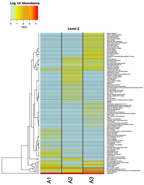 Heatmap of functional activities detected in the rhizosphere metagenomes of maize (A1); maize inoculated with UM270 (A2), and maize inoculated with UM270 in a Milpa system (A3).