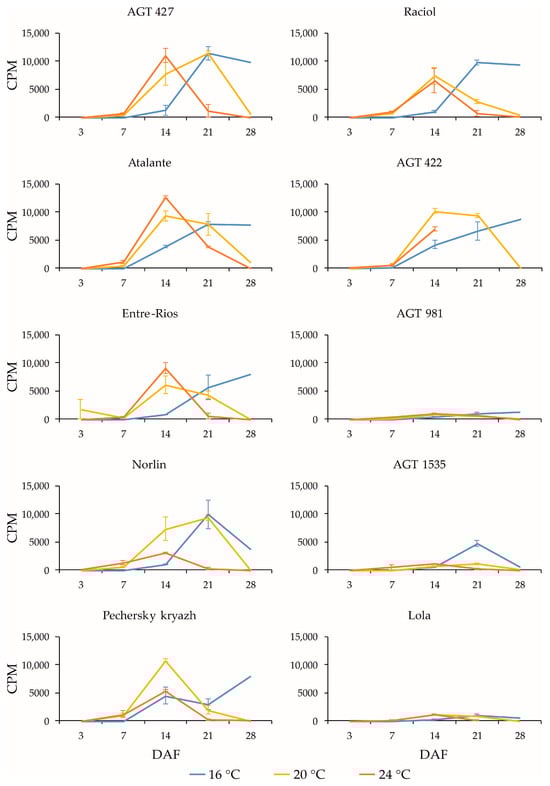 Expression profiles (3, 7, 14, 21, and 28 DAF) of SAD3-1 gene in high-LIN (AGT 427, Atalante, Entre-Rios, Norlin, and Pechersky kryazh), mid-LIN (Raciol and AGT 422), and low-LIN (AGT 981, AGT 1535, and Lola) flax varieties grown at 16 °C and overwatered (16 °C), at 20 °C and optimally watered (20 °C), and at 24 °C and underwatered (24 °C). Data are missing for 21 and 28 DAF at 24 °C for AGT 422 and 28 DAF at 24 °C for Lola. Error bars represent values obtained for two biological replicates.
