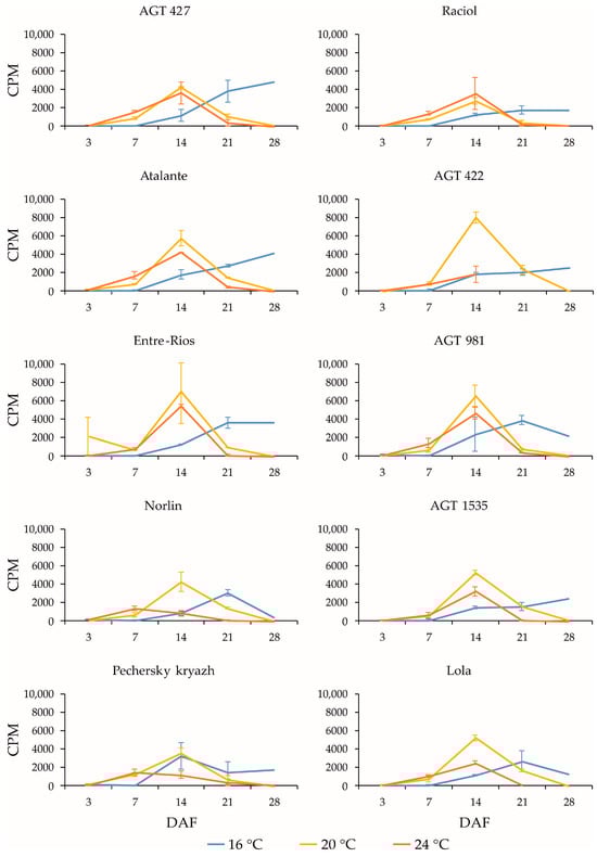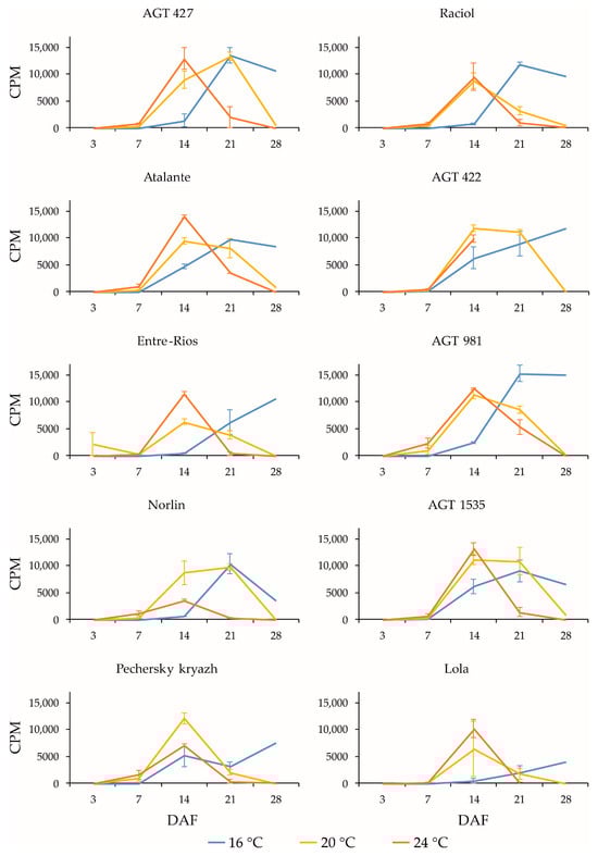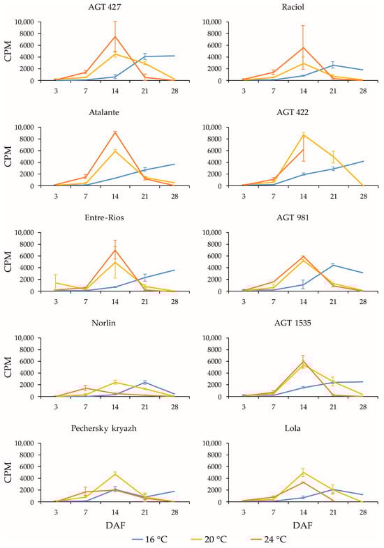 Expression profiles (3, 7, 14, 21, and 28 DAF) of FAD3b gene in high-LIN (AGT 427, Atalante, Entre-Rios, Norlin, and Pechersky kryazh), mid-LIN (Raciol and AGT 422), and low-LIN (AGT 981, AGT 1535, and Lola) flax varieties grown at 16 °C and overwatered (16 °C), at 20 °C and optimally watered (20 °C), and at 24 °C and underwatered (24 °C). Data are missing for 21 and 28 DAF at 24 °C for AGT 422 and 28 DAF at 24 °C for Lola. Error bars represent values obtained for two biological replicates.