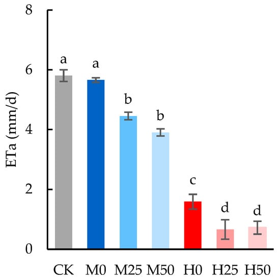The evapotranspiration (ETa) rate during drought stress. The data are expressed as the mean ± standard error (n = 3); different lower-case letters above each column show significance difference among treatments. CK refers to no drought stress and no proline application, M refers to 60% field water capacity, H refers to 45% field water capacity; 0, 25 and 50 denote 0, 25 mM, and 50 mM of proline solution applied in this study, respectively.