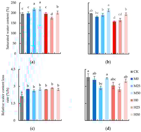 Water-holding capacity of isolated flag leaves: saturated water content at anthesis stage (a) and seed-formation stage (b), relative water-content loss rate in 24 h at anthesis stage (c) and grain-seed-formation stage (d). The data are expressed as the mean ± standard error (n = 3); different lower-case letters above each column show significance difference among treatments. CK refers to no drought stress and no proline application, M refers to 60% field water capacity, H refers to 45% field water capacity; 0, 25, and 50 denote 0, 25 mM, and 50 mM of proline solution applied in this study, respectively.