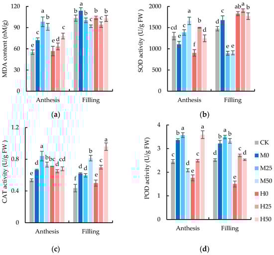 Malondialdehyde (MDA) content (a) and superoxide dismutase (SOD) (b), catalase (CAT) (c) and peroxidase (POD) (d) enzyme activities in flag leaves of wheat at anthesis and grain-filling stages. The data are expressed as the mean ± standard error (n = 3); different lower-case letters above each column show significance difference among treatments. CK refers to no drought stress and no proline application, M refers to 60% field water capacity, H refers to 45% field water capacity; 0, 25, and 50 denote 0, 25 mM, and 50 mM of proline solution applied in this study, respectively.