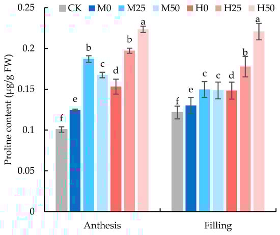 Proline content in flag leaves of wheat at anthesis and grain-filling stages. The data are expressed as the mean ± standard error (n = 3); different lower-case letters above each column show significance difference among treatments. CK refers to no drought stress and no proline application, M refers to 60% field water capacity, H refers to 45% field water capacity; 0, 25, and 50 denote 0, 25 mM, and 50 mM of proline solution applied in this study, respectively.