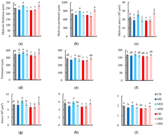 Anatomical characteristics of flag leaf: (a) main vein thickness, (b) midvein perimeter, (c) midvein area, (d) perimeter of the vascular bundle of the main vein, (e) perimeter of large vascular bundle, (f) perimeter of small vascular bundle, (g) area of the vascular bundle of the main vein, (h) area of large vascular bundle, (i) area of small vascular bundle. The data are expressed as the mean ± standard error (n = 3); different lower-case letters above each column show significance difference among treatments. CK refers to no drought stress and no proline application, M refers to 60% field water capacity, H refers to 45% field water capacity; 0, 25, and 50 denote 0, 25 mM, and 50 mM of proline solution applied in this study, respectively.