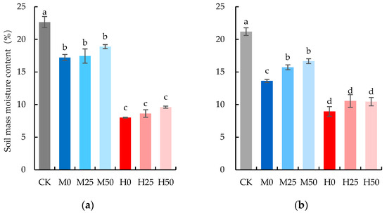 Soil mass moisture content: (a) 21 April 2022. (b) 25 April 2022. The data are expressed as the mean ± standard error (n = 3); different lower-case letters above each column show significance difference among treatments. CK refers to no drought stress and no proline application, M refers to 60% field water capacity, H refers to 45% field water capacity; 0, 25, and 50 denote 0, 25 mM, and 50 mM of proline solution applied in this study, respectively.