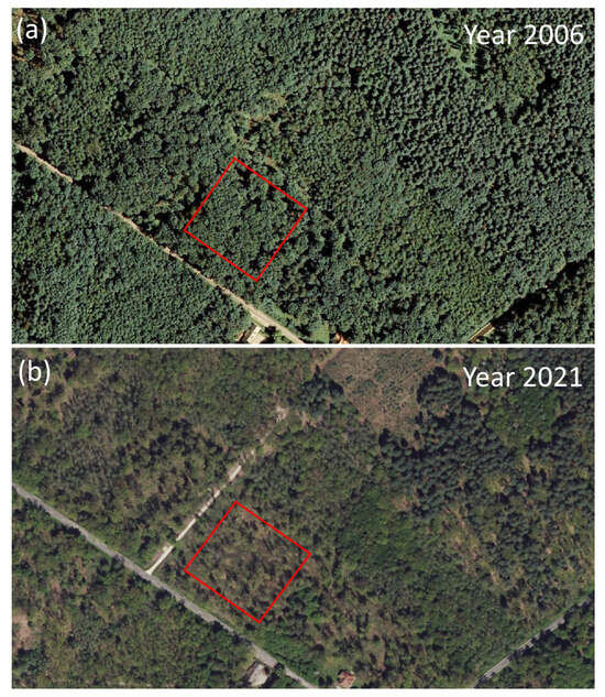 Figure 1. Satellite images from (a) 2006 and (b) 2021 for the “Dobrava” study site in a lowland oak–hornbeam forest dominated by Quercus robur, Slovenia. The red rectangle denotes a 100 × 100 m permanent research area established in 1993. The comparison reveals significant changes in stand conditions on the research plot and overall habitat degradation on the landscape level (i.e., more open and fragmented forests). Source: Slovenian Environment Agency—ARSO [31].