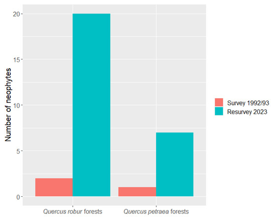 Figure 2. The total number of neophytes recorded on 25 plots in lowland oak–hornbeam forests dominated by Quercus robur and on 20 plots in colline oak–beech forests dominated by Q. petraea. The original survey was conducted in 1992/93, while the resurvey took place in 2023.
