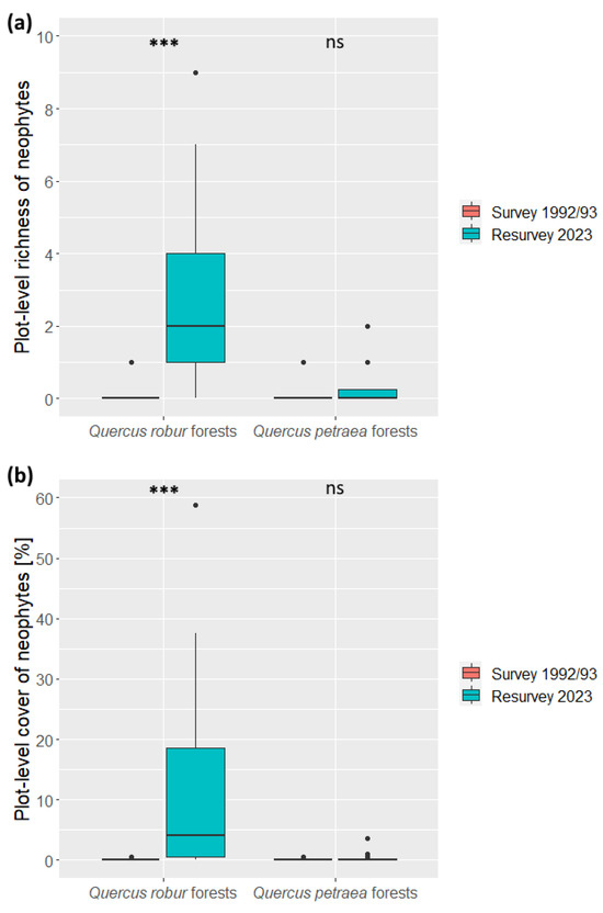 Figure 3. Temporal changes in the (a) plot-level richness and (b) plot-level cover of neophytes recorded in two oak-dominated forest vegetation types: lowland oak–hornbeam (Quercus robur) forests and colline oak–beech (Quercus petraea) forests. The original survey was conducted in 1992/93, while the resurvey took place in 2023. The difference between the two sampling periods was tested with the Wilcoxon test: *** p < 0.001, ns—not significant changes.