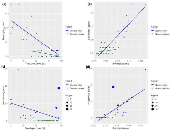 Figure 4. Linear models for the (a,b) plot-level richness (species count) and (c,d) cover (%) of neophytes along tree layer cover (a,c) and soil disturbance gradients (b,d), based on data from the 2023 vegetation resurvey. The soil disturbance gradient was calculated as the community-weighted mean of species’ disturbance indicator values, which ranged from 0.105 to 0.210 across all plots. Datapoints and regression lines are shown for lowland oak–hornbeam forests dominated by Quercus robur (blue) and for colline oak–beech forests dominated by Q. petraea (green). Note the difference in the range of the tree layer cover and soil disturbance between the two forest types. For panels c and d, different sizes of dots for Q. robur forests depict the gradient of abundance for Impatiens parviflora (Imppar), the most frequent neophyte in our dataset.