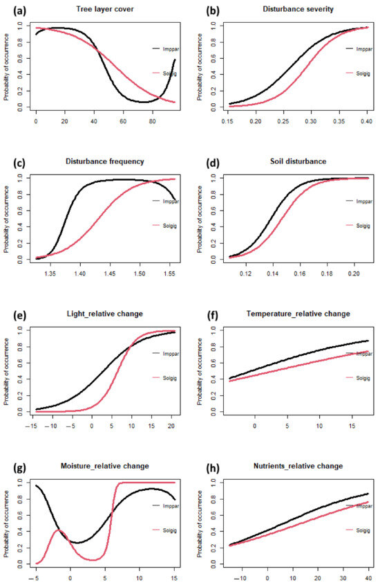 Figure 5. Species response curves for Impatiens parviflora (Imppar, black lines; present on 14 plots) and Solidago gigantea (Solgig, red lines; present on 12 plots) along gradients of selected ecological predictors: (a) tree layer cover, (b) disturbance severity, (c) disturbance frequency, (d) soil disturbance and the relative changes in (e) light conditions, (f) temperature, (g) soil moisture and (h) soil nutrients. The analysis was based on data for resurveyed plots in lowland oak–hornbeam forests dominated by Quercus robur. For details on model statistics, see Table 3.