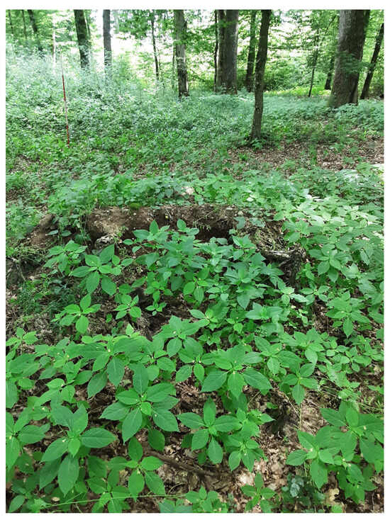 I. parviflora is the most common neophyte species in all European forests [47]. It proliferates frequently in lowland deciduous forests [30,48,49] and other vegetation types, such as heathlands or scrub vegetation [50]. Its spread has been reported in several resurvey studies [5,41,51] and is known to negatively impact native vegetation in oak–hornbeam forests [48]. According to Chmura and Sierka [37], the penetration and establishment of this species in woodlands are facilitated by propagule pressure from habitats bordering forests (such as forest roads and edges), irradiance, gaps (empty space) in the herb layer, the presence of woody debris and rooting by wild boars. Additional factors could be atmospheric nitrogen deposition [52] or overstory shading effects [5]. This common neophyte employs an acquisitive resource-use strategy and has a high colonization capacity. Among the herbaceous flora of temperate forests, I. parviflora has an extremely high specific leaf area (i.e., over 140 mm2/mg according to the LEDA database; [53]). Such functional traits enable this species to establish in low-light conditions due to shade tolerance, thus avoiding competition.