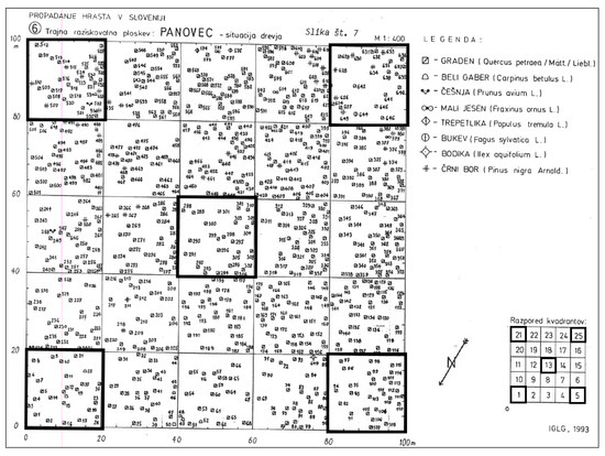 At each site, a one-hectare (100 × 100 m) permanent research area with well-preserved, homogenous stand conditions was established in the central part of the forest complex [57,58]. The research area was divided into 25 sampling plots, each measuring 20 × 20 m. In the 1992/93 survey, all trees with DBH ≥ 10 cm were measured, numbered and mapped, providing a detailed spatial scheme of the stand situation (Figure 8).