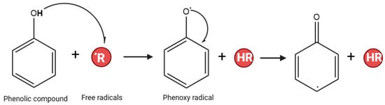 Antioxidants play a crucial role in preventing the process of oxidation. Oxidation is a chemical reaction that can produce free radicals and cause chain reactions, which can lead to significant damage to cells in organisms [18,19]. As antioxidants, phenolic compounds can act as radical scavengers. The hydroxyl group on the phenolic ring can transfer its hydrogen atom to a free radical, forming a delocalized and stabilized unpaired electron, phenoxy radical, across the phenolic ring [20]. The stabilization by the resonance effect of the aromatic nucleus prevents the continuation of the free radical chain reaction [21] (Figure 1).