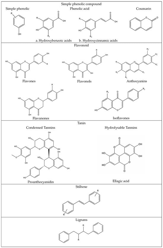 Phenolic compounds are natural metabolites that arise from the shikimate/phenylpropanoid pathway. This pathway directly provides phenylpropanoids, which are characterized by an aromatic ring with one or more hydroxyl substituents [48]. Figure 2 illustrates the various classes of phenolic compounds.