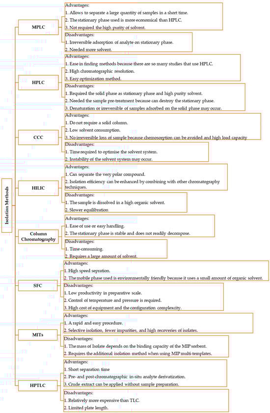 One such review was conducted by Shi et al. in 2022, in which they discussed the extraction, separation, and characterization methods, as well as the determination of antioxidant activity of phenolic compounds. The separation and characterization methods are membrane filtration, solid-phase extraction (SPE)-GC/LC (gas chromatography/liquid chromatography), liquid chromatography–mass spectrometry (LC-MS/MS), HPLC, capillary electrophoresis (CE), CCC, and CPC [21]. However, based on articles published in 2017–2023, several methods have not been discussed, including hydrophilic interaction chromatography (HILIC), supercritical fluid chromatography (SFC), MPLC, high-performance thin layer chromatography (HPTLC), and MITs methods. Therefore, this review aims to focus on the isolation methods for phenolic antioxidant compounds, including those not discussed in previous reviews.