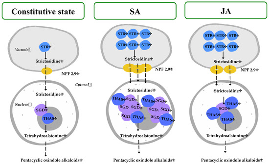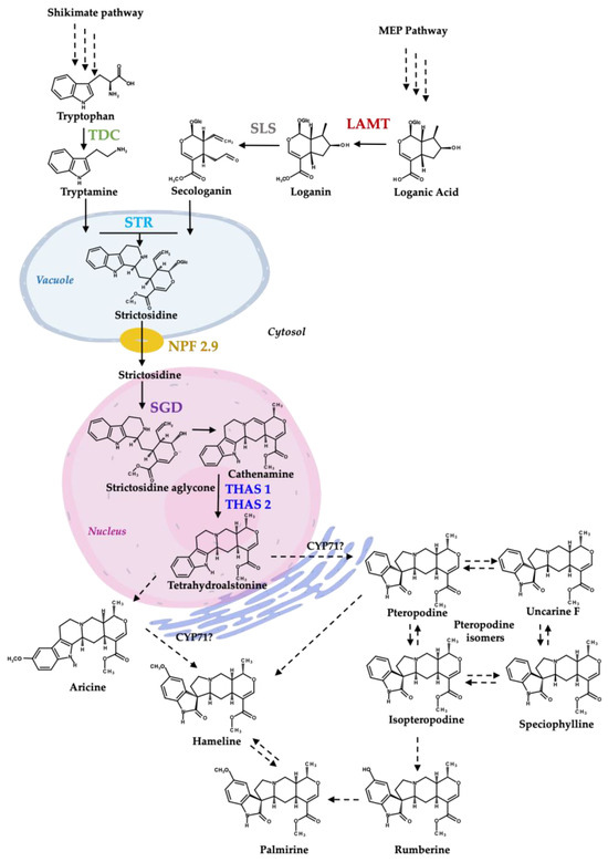 - Guirimand, G.; Guihur, A.; Ginis, O.; Poutrain, P.; Héricourt, F.; Oudin, A.; Lanoue, A.; St-Pierre, B.; Burlat, V.; Courdavault, V. The subcellular organization of strictosidine biosynthesis in Catharanthus roseus epidermis highlights several trans-tonoplast translocations of intermediate metabolites. FEBS J. 2011, 278, 749–763. [Google Scholar] [CrossRef] [PubMed]