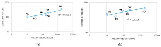 The flora of gypsum outcrops conforms to species–area relationship (SAR) patterns, with larger outcrops containing a greater number of species; the correlation between the two variables, using the power curve, is strong (R > 0.80). Utilizing the Arrhenius potential model for the sampled 1000 m2 plots and considering all species found, the value of z for these gypsum outcrops (z = 0.25) places them at the level of other continental island-like habitats.