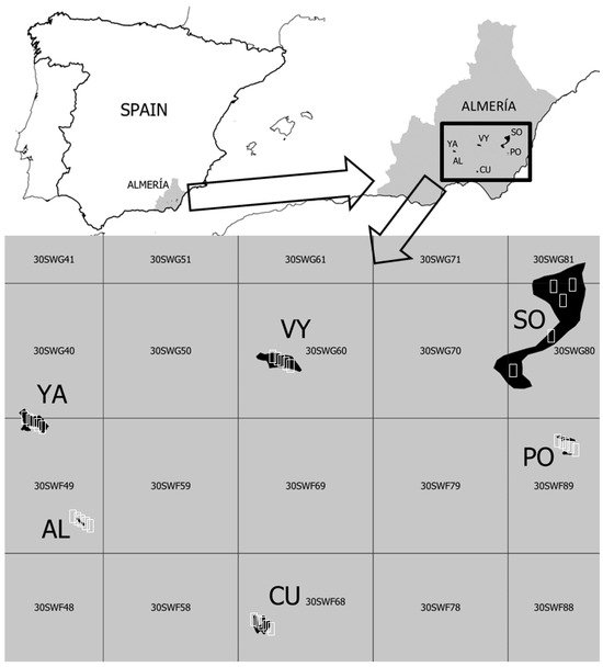 This research was conducted in six gypsum outcrops in the province of Almería, in the southeastern part of Spain, a hotspot of diversity for Spanish gypsophilous flora [,]. The locations of these outcrops are shown in Figure 3, and their main characteristics are detailed in Table 5. Additional details regarding the environmental characteristics of each of these outcrops can be found in Mota et al. []. Four of them are either entirely or partially included in the Spanish network of protected areas and integrated into the EU Natura 2000 network. However, their comprehensive conservation is not guaranteed, as the Natural Resources Management Plan (PORN, Plan de Ordenación de los Recursos Naturales) surprisingly considers mining extraction as a compatible activity with their conservation [].