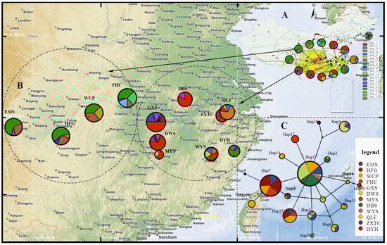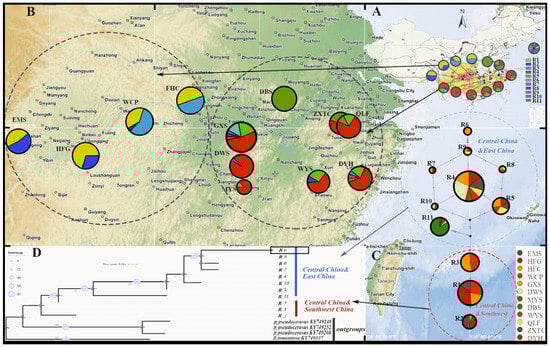 - Wang, Y.H.; Jiang, W.M.; Hans, P.C.; Hu, F.S.; Qiu, Y.-X.; Fu, C.-X. Molecular phylogeography and ecological niche modelling of a widespread herbaceous climber, Tetrastigma hemsleyanum (Vitaceae): Insights into Plio-Pleistocene range dynamics of evergreen forest in subtropical China. New Phytol. 2015, 206, 852–867. [Google Scholar] [CrossRef]