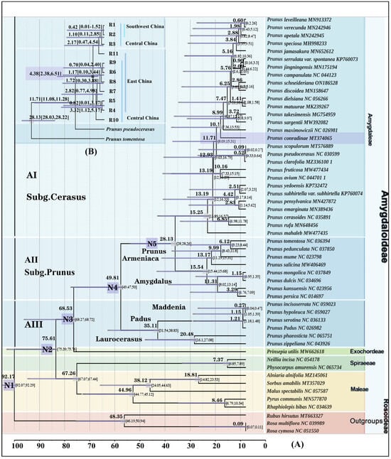 - Zhang, S.D.; Jin, J.J.; Chen, S.Y.; Chase, M.W.; Soltis, D.E.; Li, H.T. Diversification of Rosaceae since the Late Cretaceous based on plastid phylogenomics. New Phytol. 2017, 214, 1355–1367. [Google Scholar] [CrossRef]