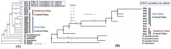Dong, J.; Yi, X.; Wang, X.; Li, M.; Chen, X.; Gao, S.; Fu, W.; Qian, S.; Zeng, X.; Yun, Y. Population Variation and Phylogeography of Cherry Blossom (Prunus conradinae) in China. Plants 2024, 13, 974. https://doi.org/10.3390/plants13070974