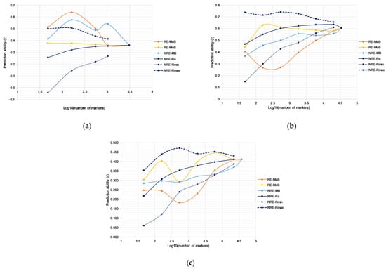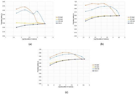 An increased prediction accuracy using SNPs associated with quantitative trait loci detected by genome-wide association study (GWAS) was observed in both animals and plants [,]. In our study, the GWAS-based strategy developed optimal marker sets by selecting 306 and 1112 markers for the MDL and GDL populations, respectively. In the MDL population, the prediction ability of the selected marker set was lower (0.4) compared to that of the smallest set obtained with the RE-MoB approach. In the GPL population, a selected set of SNPs showed a prediction ability of 0.33, which was comparable to the observed value in models using RE-MoB sets of markers and lower compared to a high-density marker set. The reason for diminished prediction success is likely because the significant SNPs only contribute a small percentage of the total genetic variation for a phenotype []. Therefore, more robust methods for the selection of SNP subsets should be applied. The application of a similar method based on GWAS marker selection and random forest (RF) algorithm for genomic prediction on the soybean dataset generated from the SoyNAM population containing 5014 recombinant inbred lines (RILs) derived from 40 biparental populations [] produced slightly higher prediction accuracies for height, time to maturity, and yield using about 10, 23, and 17% of the top SNPs, respectively [].