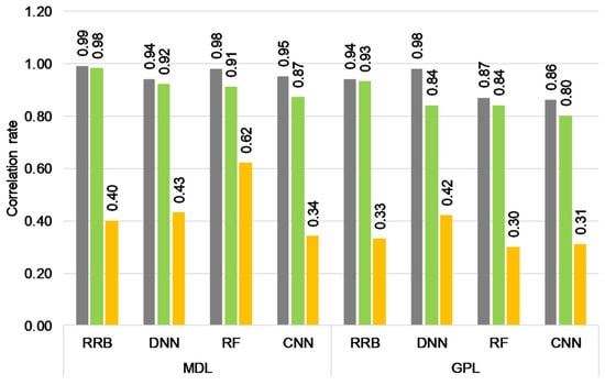 Correlation of observed and predicted phenotypes of training (grey), validation (green), and test (orange) sets in the MDL and GPL populations using different prediction models.