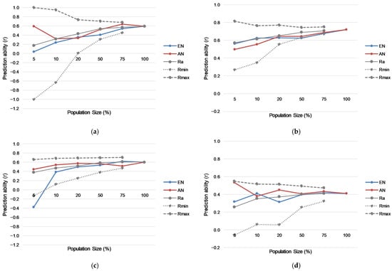 Prediction ability in both cross-validation and external validation for a random sample selection for the MDL and GPL populations plateaued around a TS size of 50% (Figure 4). Prediction ability did steadily increase up until the maximum TS size in both populations. Selective phenotyping was performed by setting up core sets using two approaches, average entry-to-nearest-entry distance (EN) and average accession-to-nearest-entry distance (AN). In cross-validation, in the MDL population, the highest value of prediction ability was observed on 75% population size, established using the AN approach. This method was in general more successful compared to EN in all cases, except for 20%. Starting from the size of 50%, and further decrements, average values of random sample selection of the same size had higher values of prediction ability. However, minimal values of prediction ability of random sample selection in all cases were lower compared to the AN selection approach. Similarly, in the MDL population in external validation, in general, AN showed higher values of prediction ability in all cases, except when population size was set at 75%, whereby the EN approach was more successful. The AN selection procedure in all cases had higher values of prediction ability compared to minimal values of prediction ability of multiple cycles of random sample selection. This approach in the MDL population and external validation had the highest values for a population size of 20% that contained 45 genotypes.