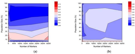 Figure 5 graphically represents the influence of the simultaneous reduction of a number of markers and population size on prediction ability (r) in the MDL population. Based on the previous results, the RE-MoB strategy was performed for marker reduction, while the AN approach was chosen for the selection of genotypes to be included in the TS. In cross-validation (Figure 5a), the highest values of prediction ability were observed for population size greater than 50%, where population size had a larger influence compared to the number of markers. Within a population of the same size, the number of markers had little effect on prediction ability (rcv). However, it was noticed that marker subsets with 48 and 163 SNPs showed the lowest values of rcv in all combinations. For a population size of 5% and marker subsets from 546 SNPs and higher, an increase in prediction ability was detected, probably as the consequence of a low number of genotypes included in the training set and consequent overfitting. In external validation (Figure 5b), a decrease in prediction ability (rev) was generally observed when the population size was set to 5%. The same was noticed only for the initial set of markers and the decrement in population size using the AN strategy (Figure 4c). However, this pattern was retained further on for all marker subsets. Besides that, the lowest values of rev were detected in all populations when the marker number was 48 SNPs. Furthermore, within a population of the same size, the highest values were discovered using subsets that included 1821, 546, and 163 SNPs, depending on the specific population.