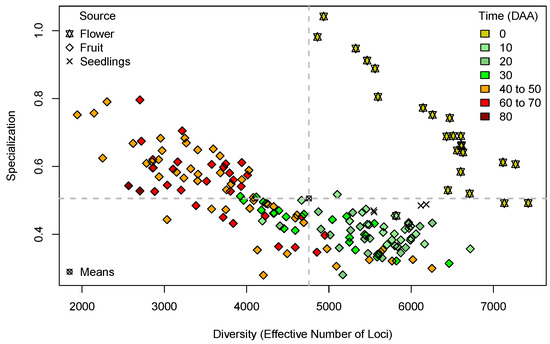 Diversity as “Effective Number of Loci” (X-axis) × Specialization (Y-axis) for each of the fruit development times for all accessions. Time points in DAA are annotated in the legend. The dashed grey line connects neighboring times.