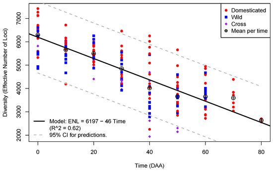 Furthermore, in Figure 2, we can appreciate how the means of ENL per time of development, shown as circles with a plus sign embedded, decrease following a linear trend. In the mature flowers, at 0 DAA, the mean of ENL is ≈6296, while in the mature fruits of the AS accession at 80 DAA, the mean has its lowest value, ≈2635, a net decrease of 3661 effective loci during the entire fruit development process. We fitted a linear model for ENL as a function of time (black line in Figure 2), and the model has an estimated intercept of 6197 with a slope of −46, indicating that, on average, the ENL steadily decreased by almost 50 loci per day of fruit development. The linear model is highly significant (p-value ), and 62% of the ENL variance is explained by the time of development (), while the residuals of the model follows a normal distribution (p-value 0.3375 in the Shapiro–Wilk test; see Supplementary SI.2 for details).
