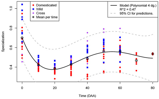 In contrast to Figure 2, where the diversity per time shows a linear relation, Figure 3 exhibits a more complex pattern for library specialization with time. Mean specialization per time, shown as a circle with a plus sign embedded, presents a global maximum of 0.7 at the mature flower (0 DAA) and a global minimum of ≈ at 20 DAA, increasing to a local maximum of ≈ at 50 DAA. The 4th-degree polynomial regression model, shown as a black line in Figure 2, is highly significant (p-value ). However, it explains less than 50% of the variation of specialization as a function of time (). Interestingly, at time points of fruit development where we have data for the 12 accessions, the maxima of specialization occurs in W accessions (blue squares) at 0, 10, 20, and 30 DAA, while the crosses, C (purple diamonds), present maxima for the parameter at 40, 50, and 60 DAA. In no case is there a maxima of specialization in a domesticated accession within the interval of 0 to 60 DAA.