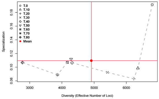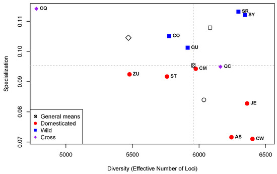 The differences in specialization (Y-axis) between types of accessions shown in Figure 4 are significant (p-value 0.009) and mainly due to the fact that the four W accessions are above the specialization mean (horizontal dashed line), while the six D accessions are below the mean. The significant differences in specialization between D (red circles) and W (blue squares) can be explained by the differences in the genetic selection pathways between those accession types. D accessions were selected from their wild ancestors, W, to accommodate human necessities, related to the domestication syndrome [33], while W accessions have evolved to adapt to their particular geographic environments. Thus, it appears reasonable that when measuring specialization in the context of accession types, the D ones are less specialized than the W ones because they share a common genetic selection pathway. In this sense, the closest accessions in the diversity by specialization space in Figure 4 are the ones from the northern Mexican state of Sonora, SR and SY, which show a high diversity and specialization.