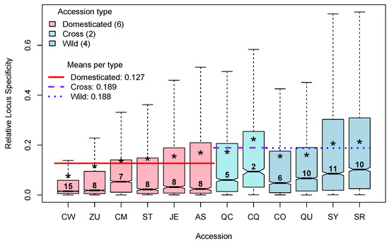 Distributions (as box plots) of the Relative Locus Specificity per accession. Asterisks point to the means of each accession. Numbers above each median are percentages of each class (% of the total of 33,007 loci). Colored lines show the means of each group.