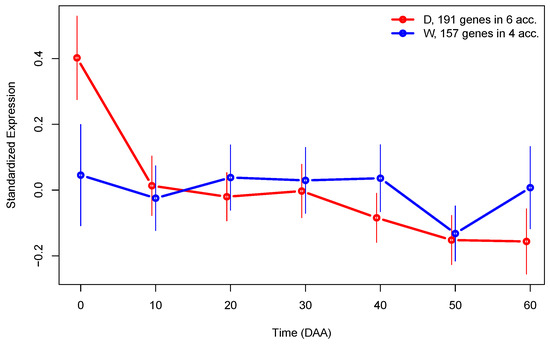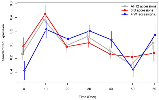 Previously, in [26], using de novo assembling for the transcriptome of a single accession (ST), and sampling only at 10, 20, 40, and 60 DAA, we observed that the specialization increased from 20 to 60 DAA and that diversity presented a global minimum at 60 DAA in that accession. These results are consistent with the general pattern shown in Figure 1 for the full set of accessions.