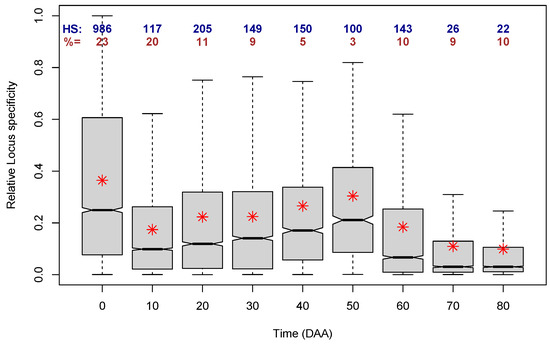 Distributions (as box plots) of the Relative Locus Specificity per time of fruit development over all accessions. Red asterisks indicate the mean of each distribution. Blue numbers (HS:) indicate the number of loci with Relative Specificity > 0.9. Brown numbers (%=) indicate the percentage of the total number of cases per time of development (% of the total of 33,007 loci).