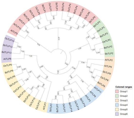3.1. Classification and Phylogenetic Analysis of Arabidopsis thaliana, Oryza sativa, Sorghum bicolor, and Brachypodium distachyon TLP Genes